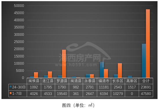 图三为2025年11月24日-12月7日福州所辖八县(市)区住宅签约面积对比图。上周福州八县(市)区住宅47580㎡,环比前一周增加23889㎡,增幅高达100.83%。