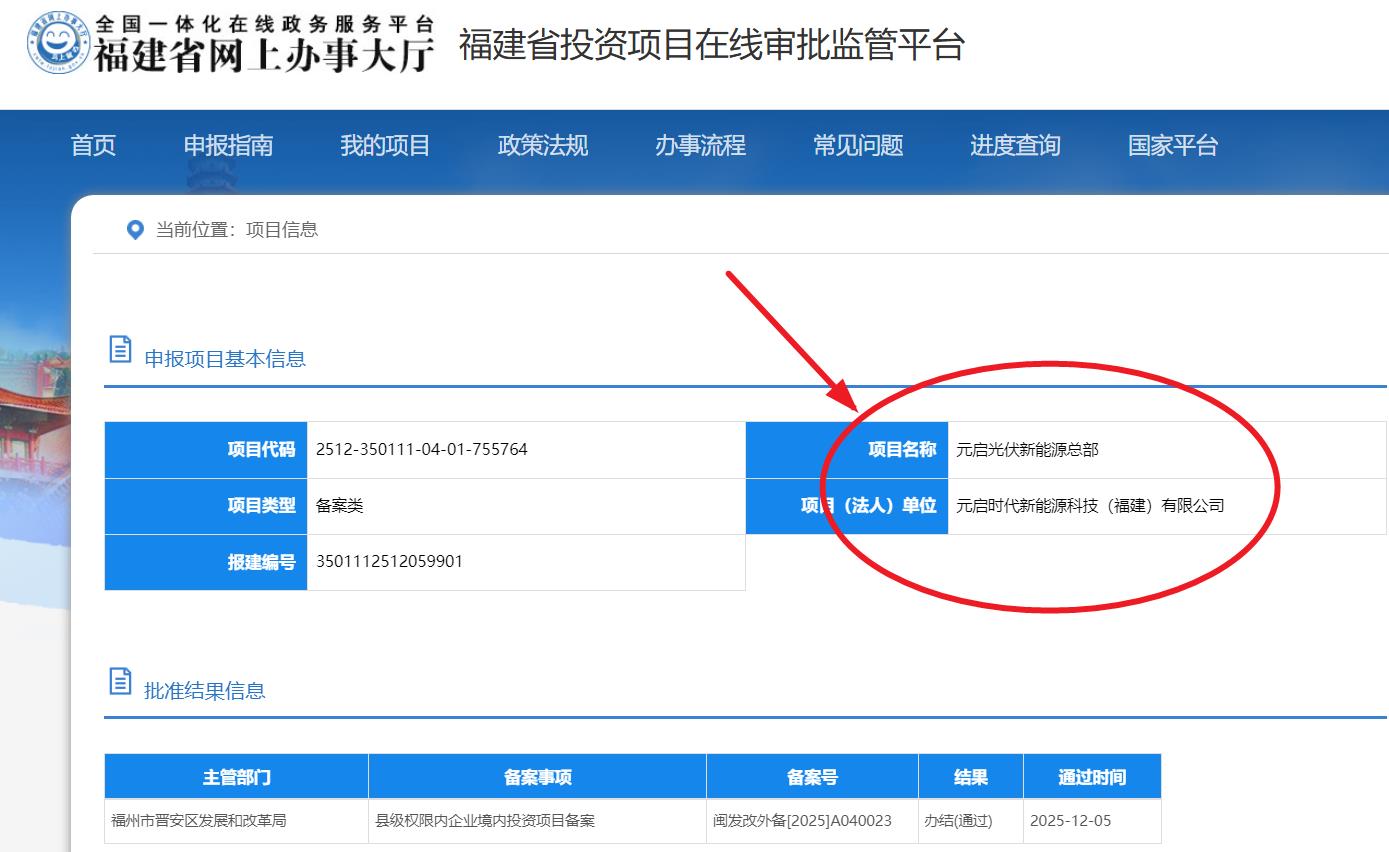 海西房产网(微信公众号:fjhxfcw)消息:福建省投资项目在线审批监管平台发布信息显示,“元启光伏新能源总部”已于12月5日取得县级权限内企业境内投资项目备案,批准结果信息为办结(通过)。