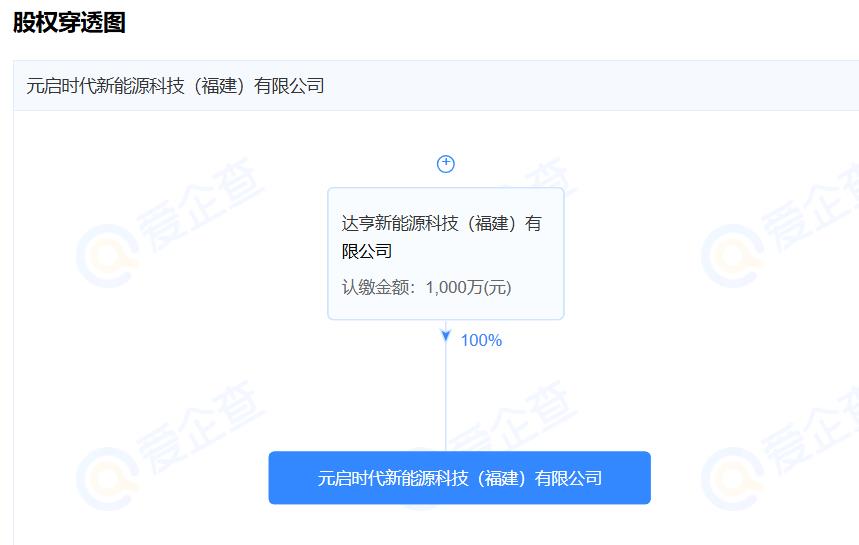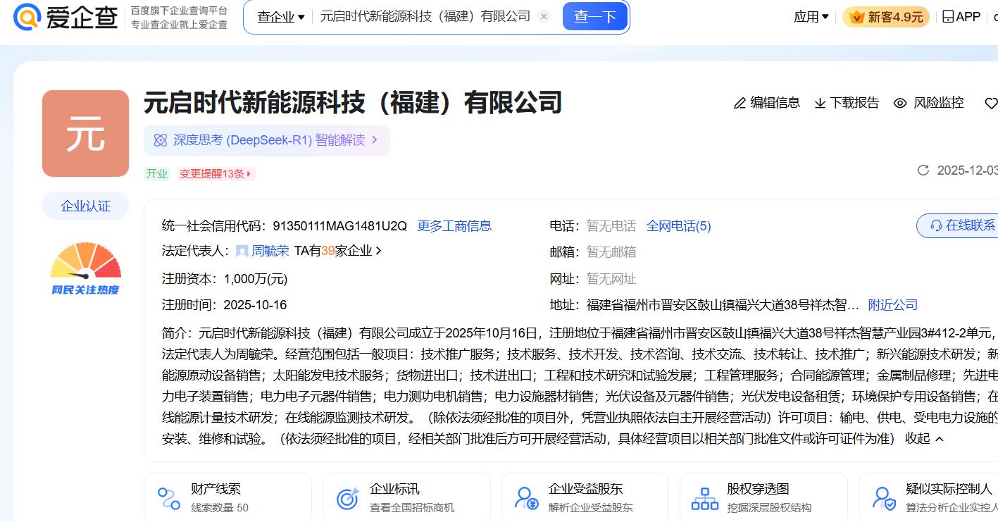 爱企查平台显示,元启时代新能源科技(福建)有限公司成立于2025年10月16日,注册地位于福建省福州市晋安区鼓山镇福兴大道38号祥杰智慧产业园3#412-2单元,法定代表人为周毓荣。