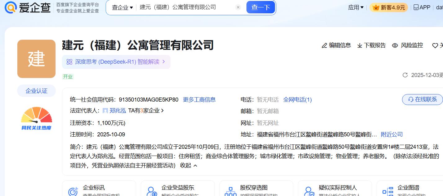 爱企查平台显示,建元(福建)公寓管理有限公司成立于2025年10月09日,注册地位于福建省福州市台江区鳌峰街道鳌峰路50号鳌峰街道安置房1#楼二层2413室,法定代表人为郑兆泓。