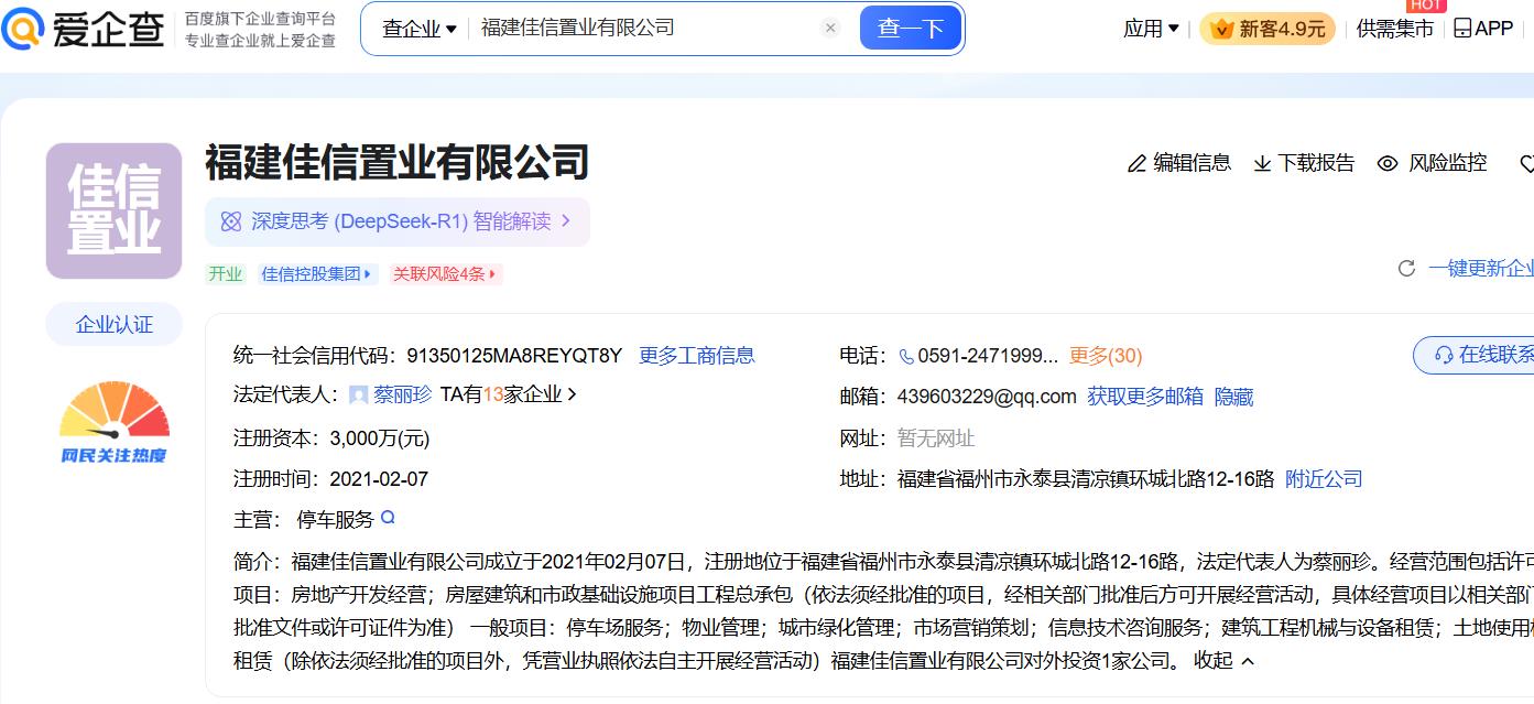 福建佳信置业有限公司成立于2021年02月07日,注册地位于福建省福州市永泰县清凉镇环城北路12-16路,法定代表人为蔡丽珍。