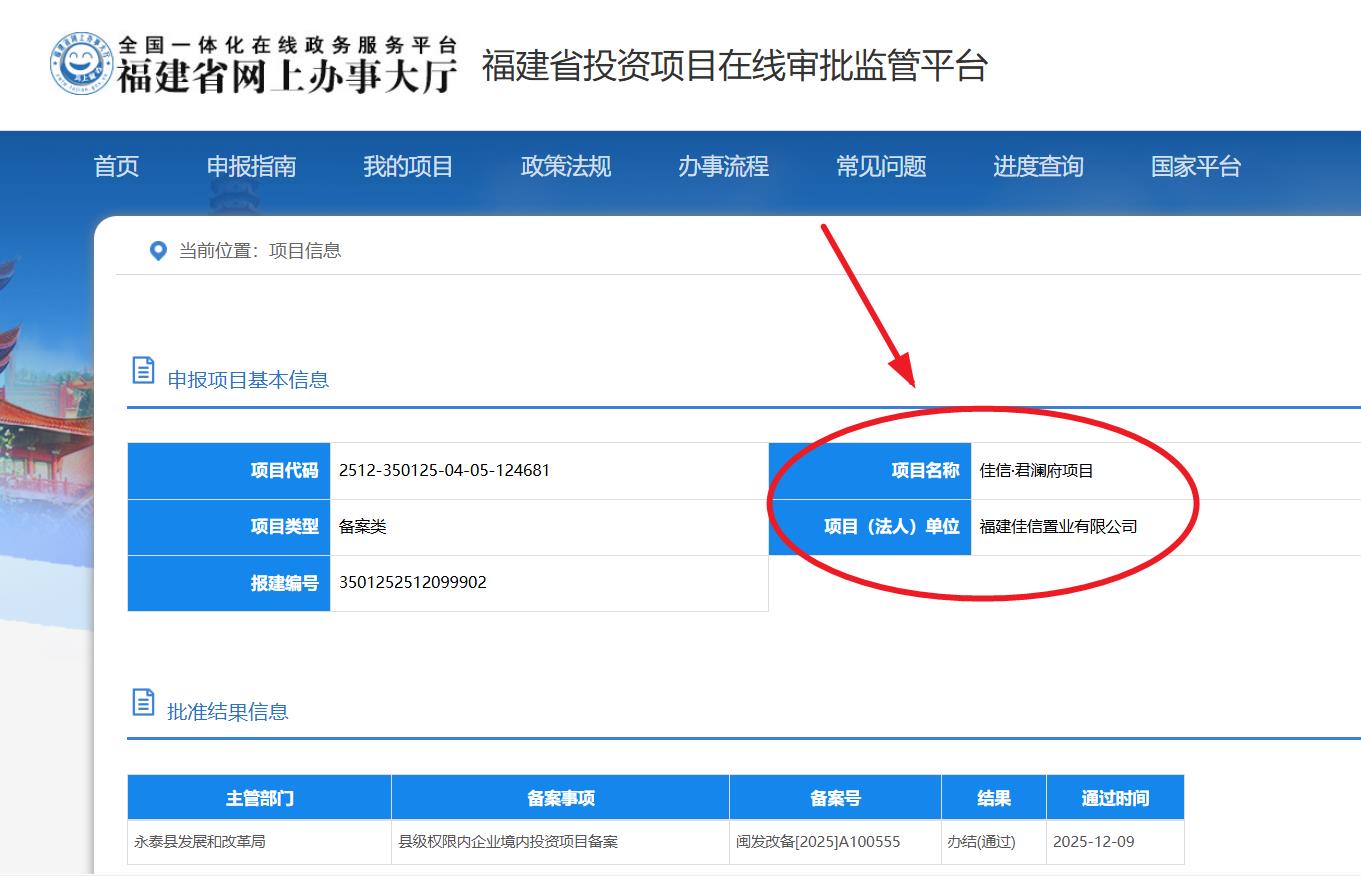 海西房产网(微信公众号:fjhxfcw)消息:福建省投资项目在线审批监管平台发布信息显示,“佳信·君澜府项目”已于12月9日取得县级权限内企业境内投资项目备案,批准结果信息为办结(通过)。