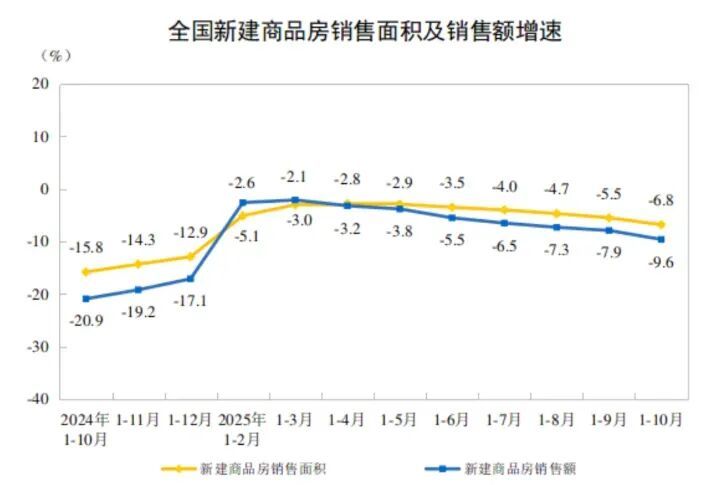 今年1-10月份,全国房地产开发投资73563亿元,同比下降了14.7%,其中住宅投资下降了13.8%。新建商品房销售面积同比下降6.8%,销售额下降9.6%。