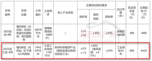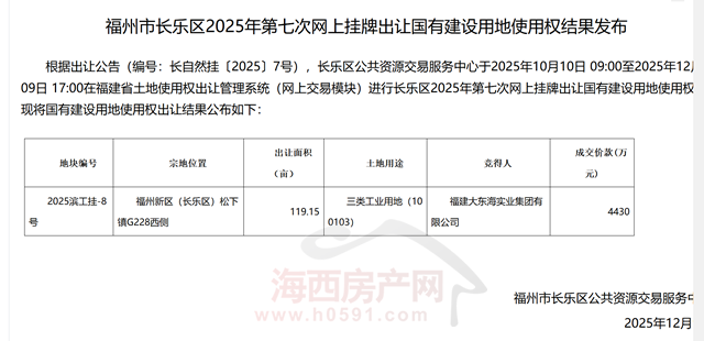 最终,福建大东海实业集团有限公司通过挂牌方式,以底价4430万元竞得长乐2025滨工挂-8号地块。