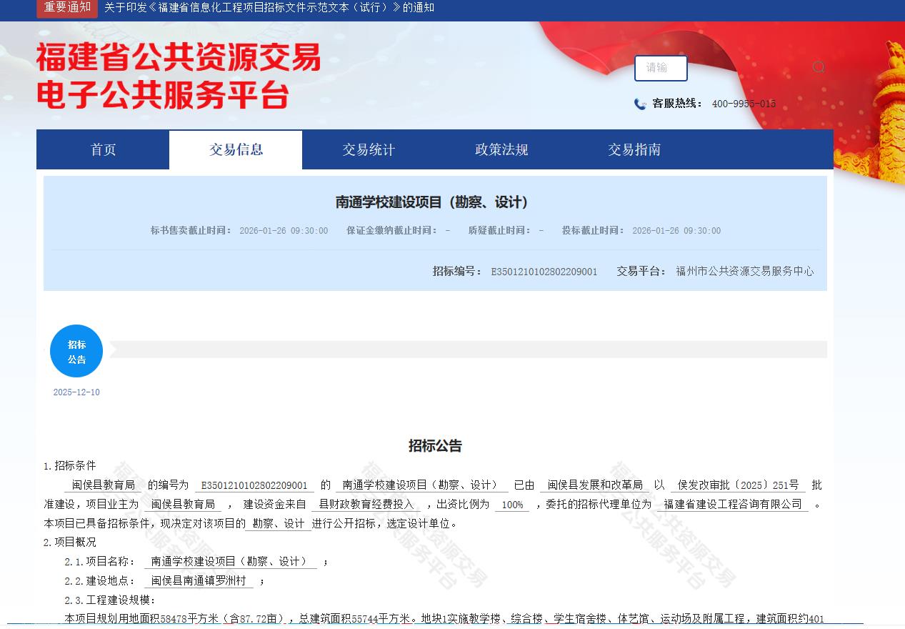 海西房产网(微信公众号:fjhxfcw)消息:2025年12月10日,福州市公共资源交易服务中心发布“南通学校建设项目(勘察、设计)”。