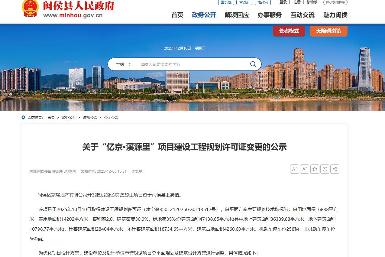 海西房产网(微信公众号:fjhxfcw)消息:2025年12月5日,闽侯县自然资源和规划局发布关于“亿京·溪源里”项目建设工程规划许可证变更的公示 。