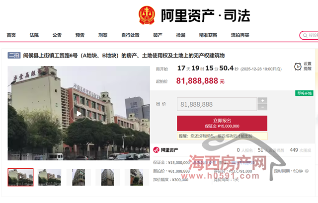 拍卖起拍价:81888888元,保证金:1500万元,增价幅度:30万元。以上起拍价不含买卖双方交易的税费及各种欠费。
