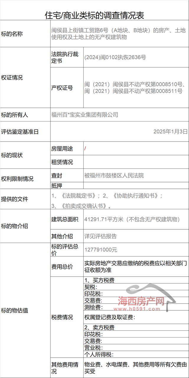 标的调查情况表显示,该标的所有人为福州百利宝实业集团有限公司,产权证号:闽(2021)闽侯县不动产权第0008510号、闽(2021)闽侯县不动产权第0008511号;目前已被被福州市鼓楼区人民法院查封,法院执行裁定书:(2024)闽0102执恢2636号。
