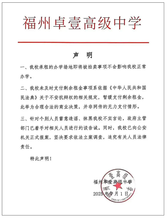 早在今年7月1日,卓壹中学就曾发布声明称,其承租的办学场地即将被拍卖事项不会影响正常办学。并表示其暂缓支付剩余租金为合理合法的商业决策,并非网传的无力支付情形。
