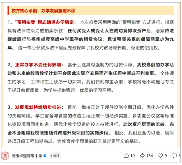 7月9日,卓壹中学再次发布声明,称本次拍卖采用明确的“带租拍卖”方式进行。根据具有法律约束力的拍卖条款,任何买受人或受让人在成功竞得该资产后,必须依法继续履行与学校现存的租赁协议,且该租赁关系的保障期至少为九年。