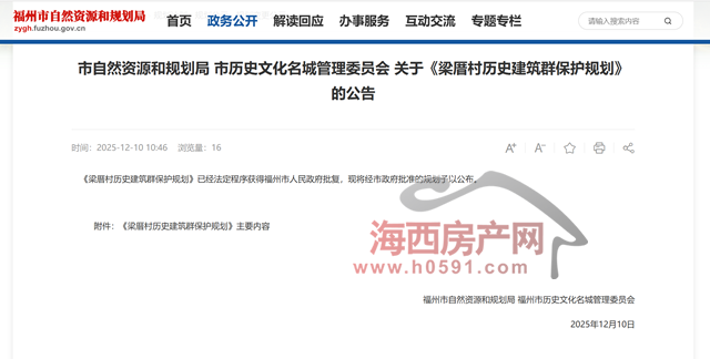 公告指出,《梁厝村历史建筑群保护规划》已经法定程序获得福州市人民政府批复,现将经市政府批准的规划予以公布。