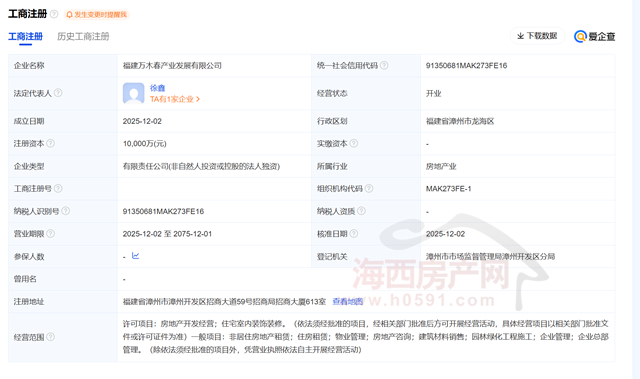 海西房产网(微信公众号:fjhxfcw)消息:爱企查显示,福建万木春产业发展有限公司于2025年12月2日注册成立,注册地位于福建省漳州市漳州开发区招商大道59号招商局招商大厦613室,法定代表人为徐鑫。