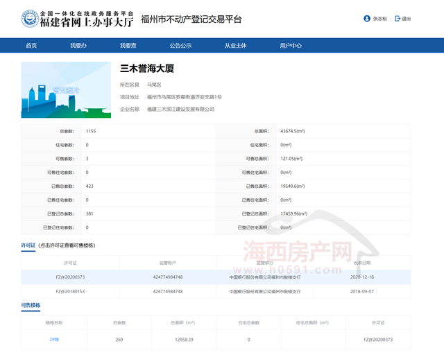 福州市不动产登记交易平台显示,"三木海立方”首批房源于2018年9月7日取得预售,目前已售总套数423套,已售面积19549.6㎡,登记总套数381套,已登记总面积17459.96㎡。