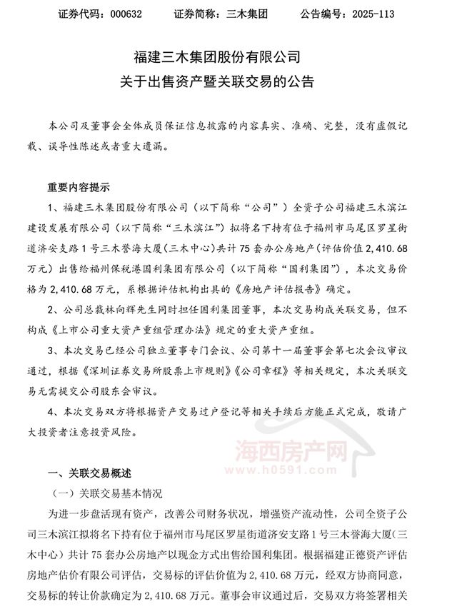 公告透露,福建三木集团股份有限公司全资子公司福建三木滨江建设发展有限公司拟将名下持有位于福州市马尾区罗星街道济安支路1号三木誉海大厦(三木中心)共计75套办公房地产(评估价值 2410.68万元)出售给福州保税港国利集团有限公司,本次交易价格为 2410.68万元。