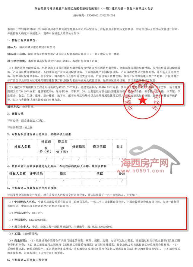 海西房产网(微信公众号:fjhxfcw)消息:12月10日,福州市电子招标交易系统公布“闽台经贸可持续发展产业园区及配套基础设施项目(一期)建设运营一体化中标候选人公示”。