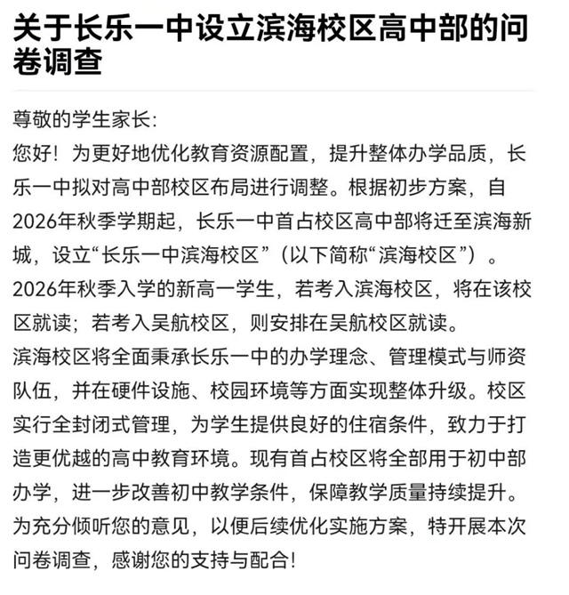 根据此前相关自媒体爆料,长乐一中近期开展设立滨海校区高中部问卷调查。