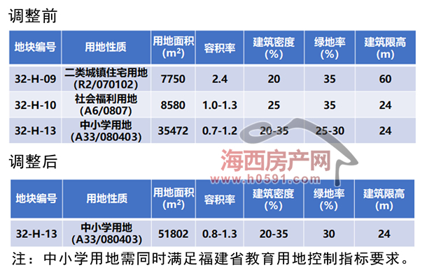 32-H-13地块,中小学用地(A33/080403),用地面积由35472平方米调整为51802平方米,容积率由0.7-1.2调整为0.8-1.3,绿地率≥30%,其余规划指标不变,后续建设需同时满足福建省教育用地控制指标要求。