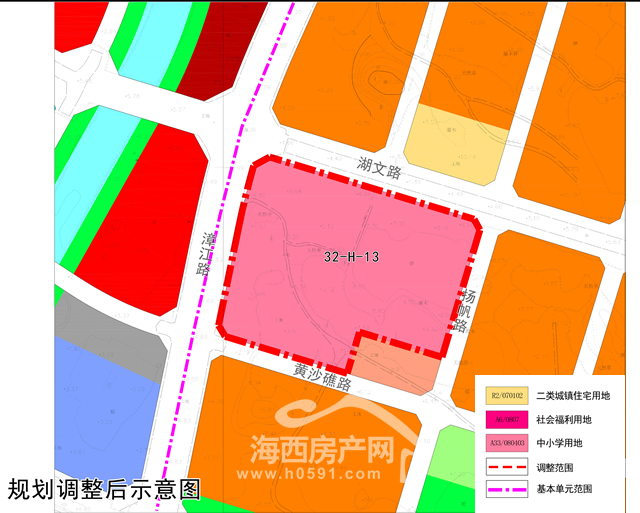 将H-09、10地块用地性质由二类城镇住宅用地(R2/070102)、社会福利用地(A6/0807)调整为中小学用地(A33/080403),并入H-13地块,H-10地块新村养老院在32分区单元内另行选址,规划床位数为150床。