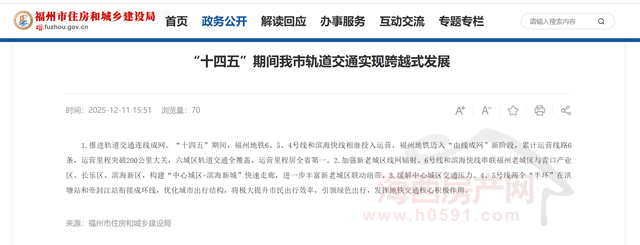 海西房产网(微信公众号:fjhxfcw)消息:12月11日,福州市住房和城乡建设局官网刊发一则消息,介绍“十四五”期间福州市轨道交通实现跨越式发展。