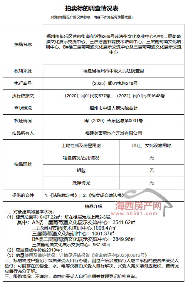 位于福州市长乐区营前街道和谐路289号莱法州文化商业中心A#楼二层葡萄酒文化展示交流中心、三层德国节能技术培训中心、三层葡萄酒文化培训中心、B#楼二层葡萄酒文化展示交流中心及三层葡萄酒文化展示交流中心【权证号:闽(2020)长乐区总第0001号】,建筑面积:10427.22㎡,用途:文化设施用地。