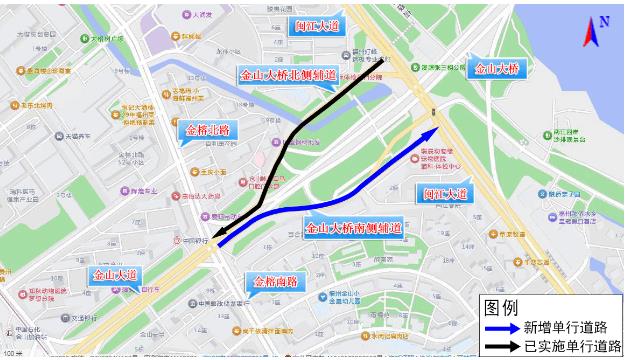 经福州市市政建设开发有限公司申请,因金山大道提升改造施工需要,为确保道路交通有序、安全、畅通,根据《中华人民共和国道路交通安全法》第三十九条规定,决定从2025年12月20日至施工结束(工期约1.5个月),对金山大桥南侧辅道(西起金榕北路口,东至闽江大道口)实行机动车由西往东单向通行。