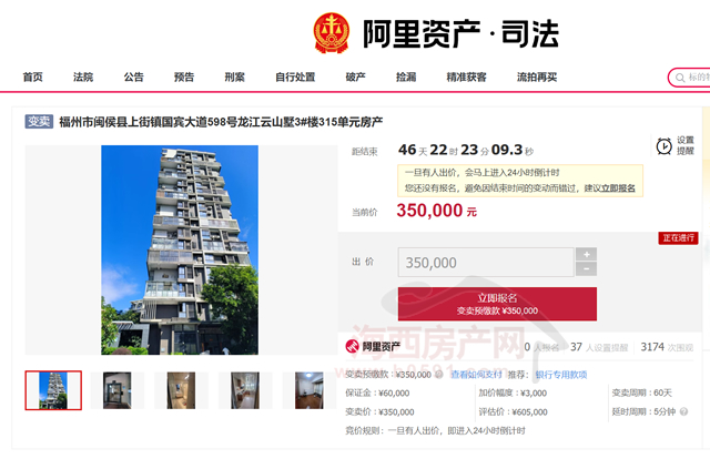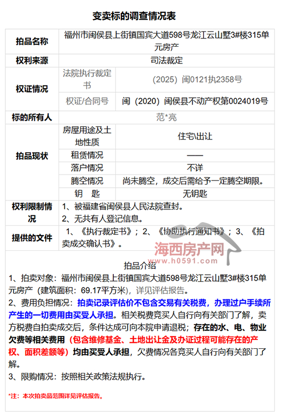 变卖标的调查情况表显示,福州市闽侯县上街镇国宾大道598号龙江云山墅 (QQ群:135074296)3#楼315单元房产(建筑面积:69.17平方米),房屋用途为住宅,目前已被被福建省闽侯县人民法院查封。
