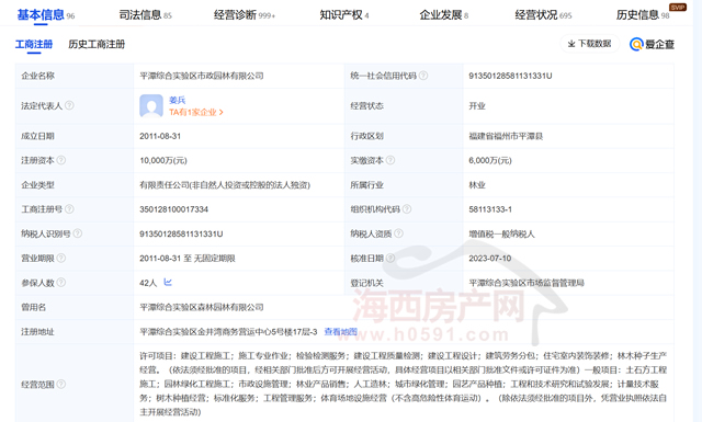 爱企查资料显示,平潭综合实验区市政园林有限公司成立于2011年08月31日,注册地位于平潭综合实验区金井湾商务营运中心5号楼17层-3,法定代表人为姜兵。