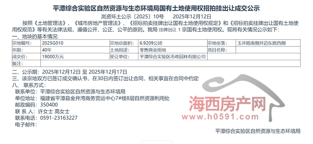 海西房产网(微信公众号:fjhxfcw)消息:12月12日,平潭综合实验区自然资源与生态环境局发布一则国有土地使用权招拍挂出让成交公示。