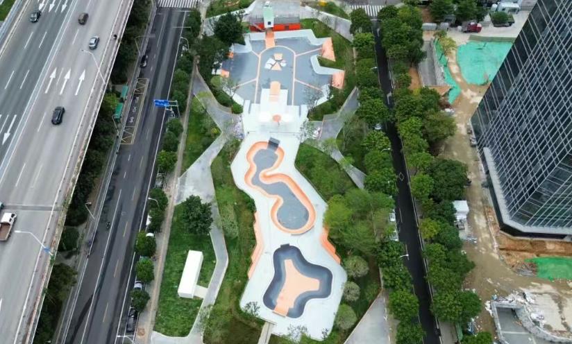 这是一个占地约5500平方米的现代化公共空间,巧妙融合运动设施与生态景观,以滑板公园为核心,打造出集运动挑战、休闲社交与自然观赏于一体的城市活力新焦点。