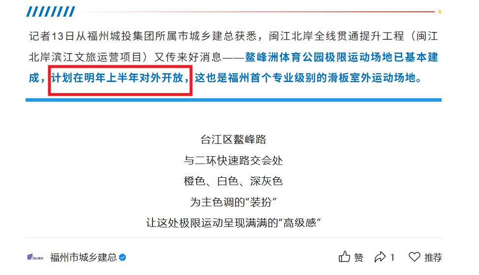 海西房产网(微信公众号:fjhxfcw)消息:2025年12月13日,媒体从福州城投集团所属市城乡建总获悉,闽江北岸全线贯通提升工程(闽江北岸滨江文旅运营项目)又传来好消息——鳌峰洲体育公园极限运动场地已基本建成,计划在明年上半年对外开放,这也是福州首个专业级别的滑板室外运动场地。