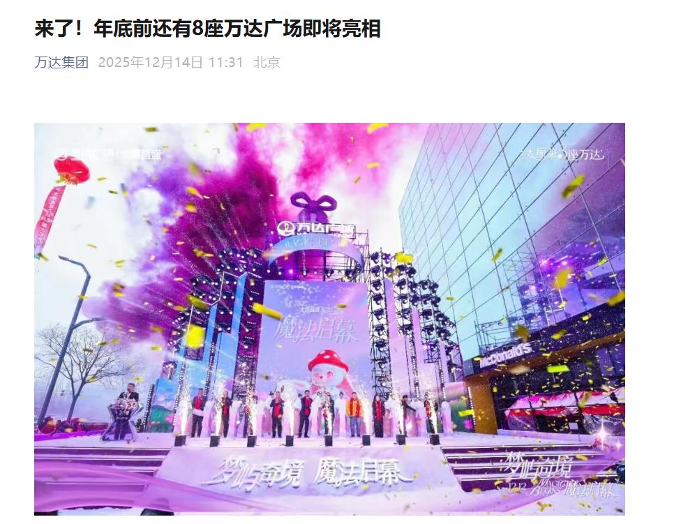 12月19日,重庆奉节、三明尤溪、赣州龙南、济南世纪大道、泉州鲤城5座万达广场将开业。12月25日,长春万达茂将开业。12月26日,黄冈红安万达广场、株洲神农万达广场将开业。