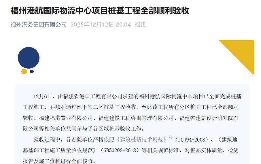 福州港航国际物流中心项目位于福清市江阴港区,总建筑面积约5.3万平方米。桩基工程的全面验收通过,标志着福州港航国际物流中心项目基础施工阶段取得重要进展,为后续主体结构施工奠定了坚实基础。港口工程将继续秉持高标准、严要求,科学组织施工,确保工程整体顺利推进。