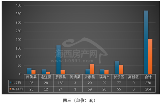 “长乐”、“永泰”和“福清”位列前三位,上周分别签约6683㎡、5794㎡和4683㎡,环比前一周一升两降。