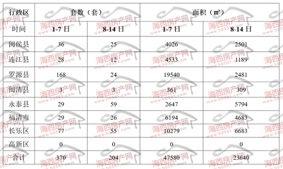 剩下的“闽清”签约309㎡,环比前一周减少52㎡,“高新区”继续零签约。