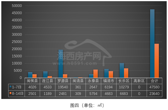 图四为2025年12月1日-14日福州下辖八县(市)区住宅签约面积对比图。周福州八县(市)区住宅签约23640㎡,环比前一周减少23940㎡,降幅高达50.31%。