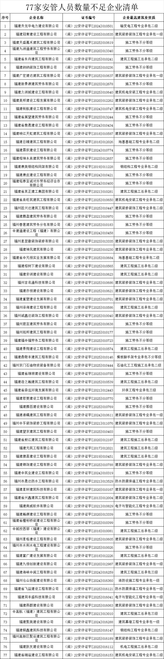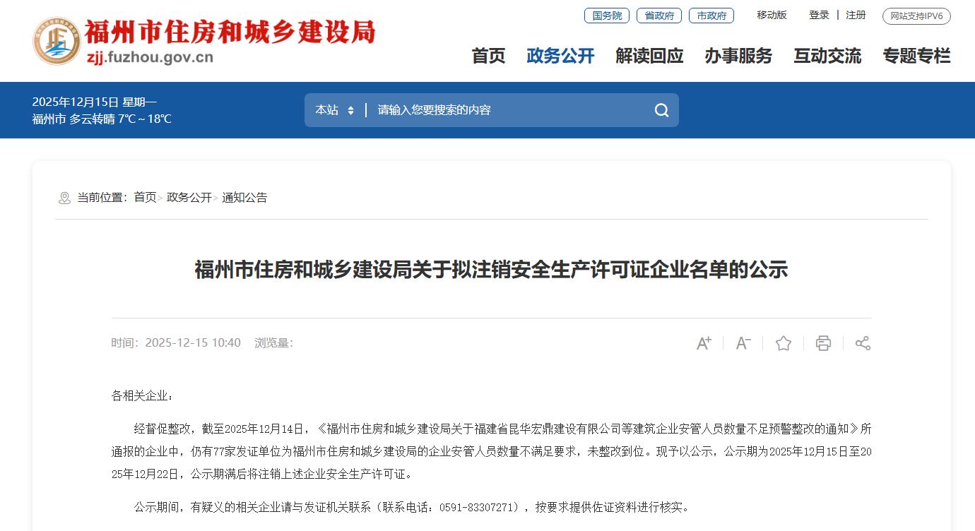 经督促整改,截至2025年12月14日,《福州市住房和城乡建设局关于福建省昆华宏鼎建设有限公司等建筑企业安管人员数量不足预警整改的通知》所通报的企业中,仍有77家发证单位为福州市住房和城乡建设局的企业安管人员数量不满足要求,未整改到位。现予以公示,公示期为2025年12月15日至2025年12月22日,公示期满后将注销上述企业安全生产许可证。