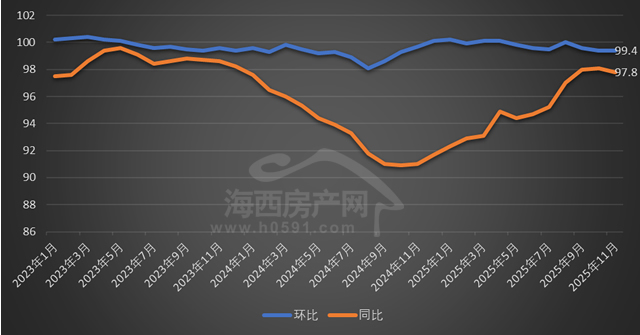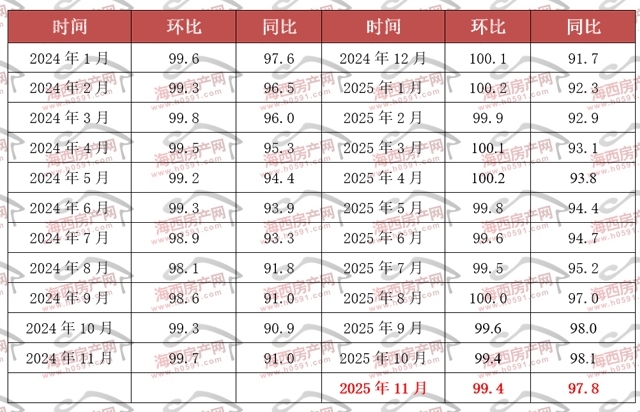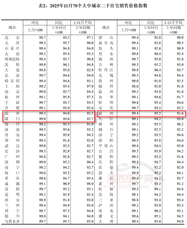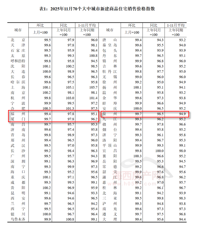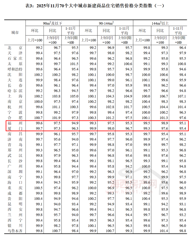 国家统计局数据显示,2025年11月福州新建商品住宅销售价格环比下跌0.6%,同比下跌2.2%;厦门环比下跌0.3%,同比下跌2.2%;泉州环比下跌0.3%,同比下跌1.5%。