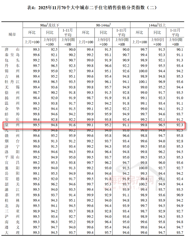 在面积段方面,11月份福州90㎡以下新建商品住宅销售价格环比下跌0.4%,同比下跌2.5%;厦门环比下跌0.3%,同比下跌2.7%;泉州环比下跌0.4%,同比下跌0.9%。
