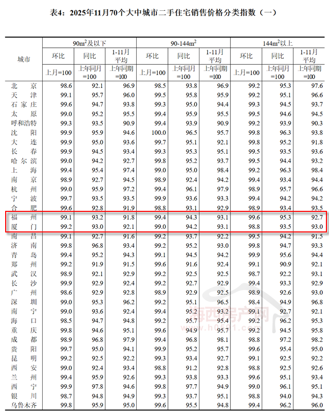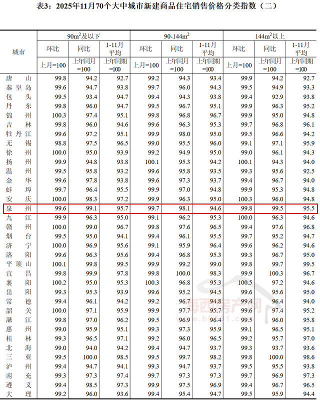 11月福州90-144㎡新建商品住宅销售价格环比下跌0.3%,同比下跌2.5%;厦门环比下跌0.1%,同比下跌2.0%;泉州环比下跌0.3%,同比下跌1.9%。