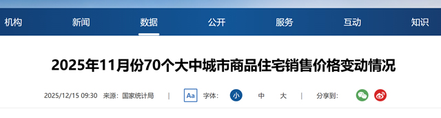 2025年11月份,70个大中城市商品住宅销售价格环比总体下降、同比降幅扩大。