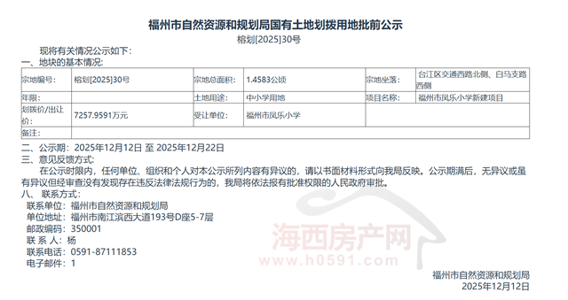 该地块编号榕划[2025]30号,宗地面积1.4583公顷(21.87亩),划拨价7257.9591万元。根据约定,该地块用于建设福州市凤乐小学新建项目。