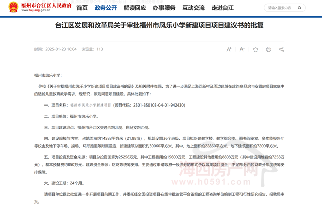 2025年1月23日,台江区发展和改革局发布“关于审批福州市凤乐小学新建项目项目建议书的批复”。