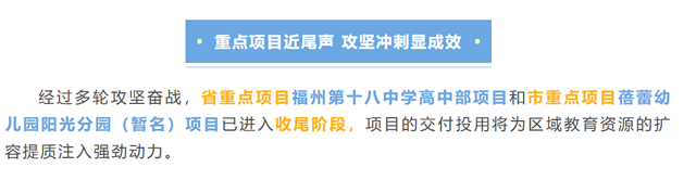 其中,经过多轮攻坚奋战,省重点项目福州第十八中学高中部项目项目已进入收尾阶段,项目的交付投用将为区域教育资源的扩容提质注入强劲动力。