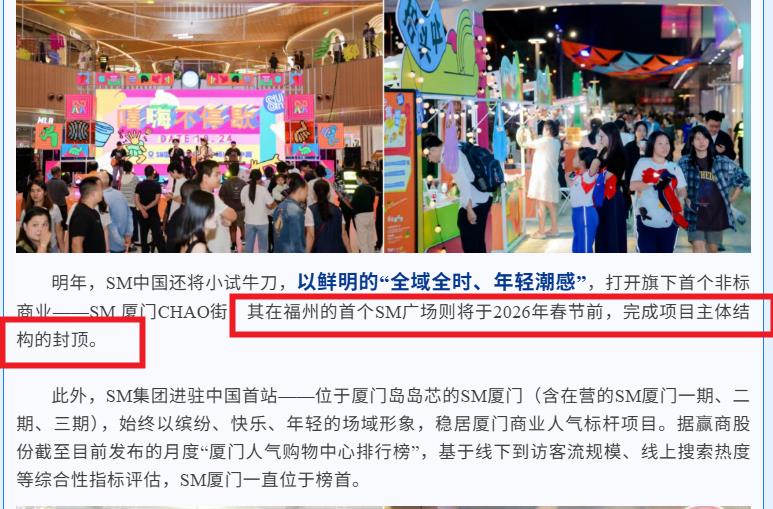 2025年12月11日,据成都SM广场服务号报道,SM中国荣登2025年度赢商网发布的“零售商业地产企业综合实力TOP100榜”。SM厦门位列“2025年度人气购物中心TOP100榜”。其中也透露了福州SM广场的最新消息。