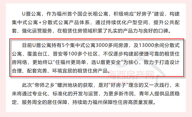 海西房产网(微信公众号:fjhxfcw)消息:12月15日,福州左海集团对外透露,近日U厝公寓成功竞得仓山区螺洲板块一宗保障性租赁住房用地(宗地编号:2025-78号),标志着其在福州保障性租赁住房布局上再落一子,U厝公寓第6个集中式公寓项目即将诞生。