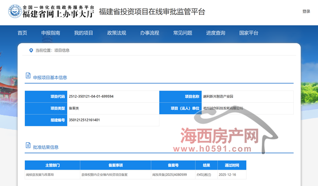 海西房产网(微信公众号:fjhxfcw)消息:福建省投资项目在线审批监管平台发布信息显示,“越利新光智造产业园”已于12月16日通过备案报建。