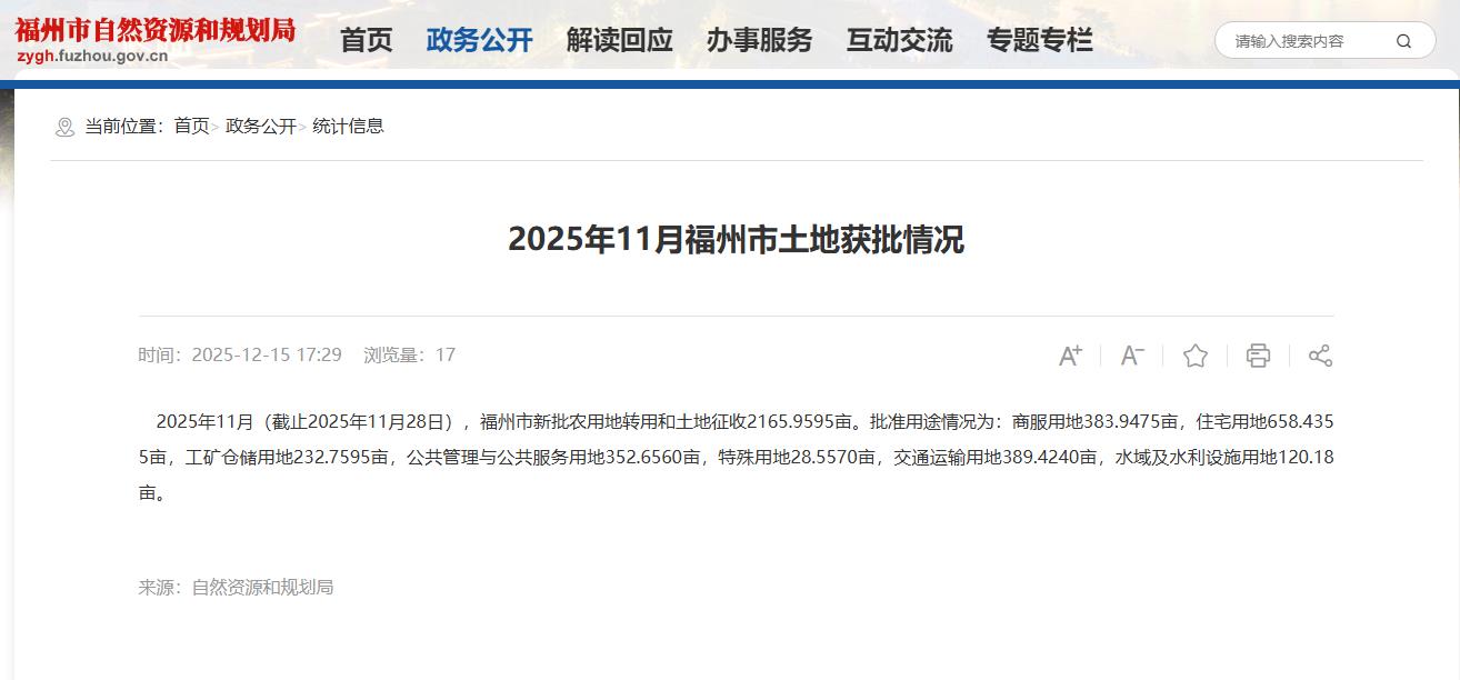 2025年11月(截止2025年11月28日),福州市新批农用地转用和土地征收2165.9595亩。
