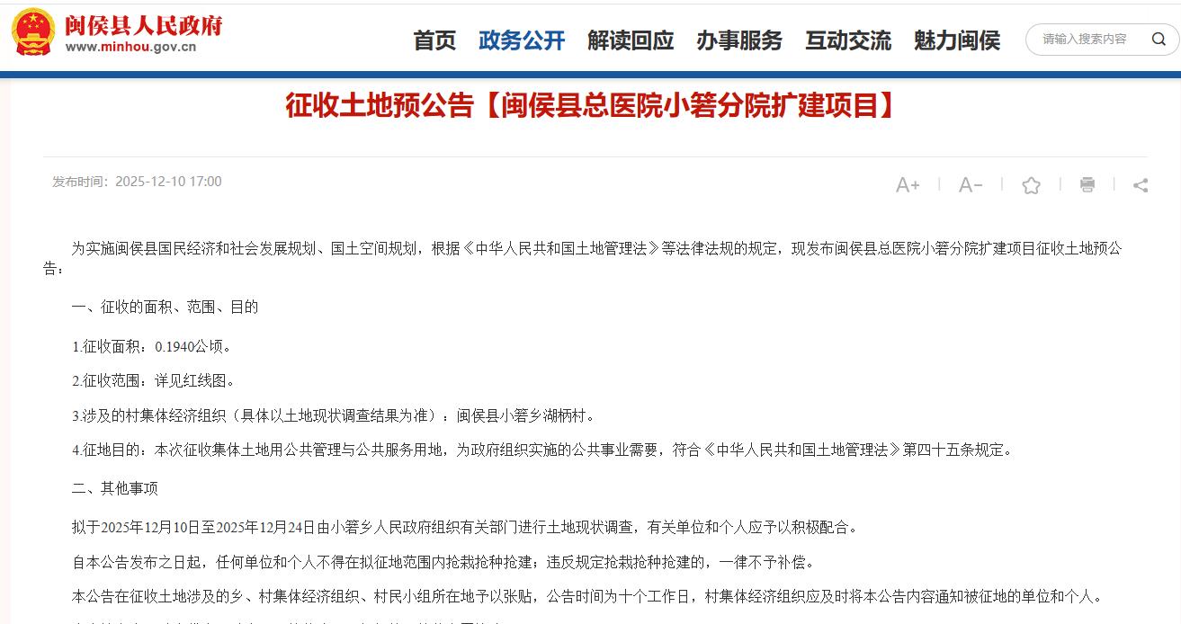 2025年9月1日,闽侯县自然资源和规划局发布“关于闽侯县总医院小箬分院扩建项目详细规划(含用地 论证专章)的公示”。
