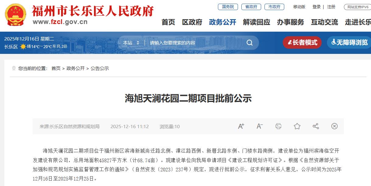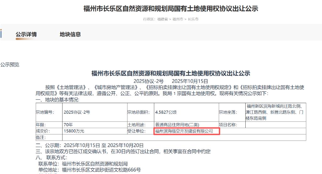 2025年10月15日,福州市长乐区自然资源和规划局发布一则协议出让公示。长乐区2025协议-2号地块(即海旭天澜花园二期)将协议出让于福州滨海临空开发建设有限公司(市属国企新区集团旗下),成交价为15800万元。