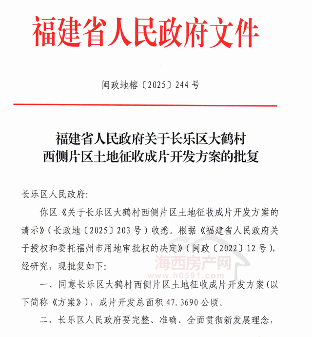 海西房产网(微信公众号:fjhxfcw)消息:12月16日,福建省人民政府发布“关于长乐区大鹤村西侧片区土地征收成片开发方案的批复(闽政地榕〔2025〕244号)”。